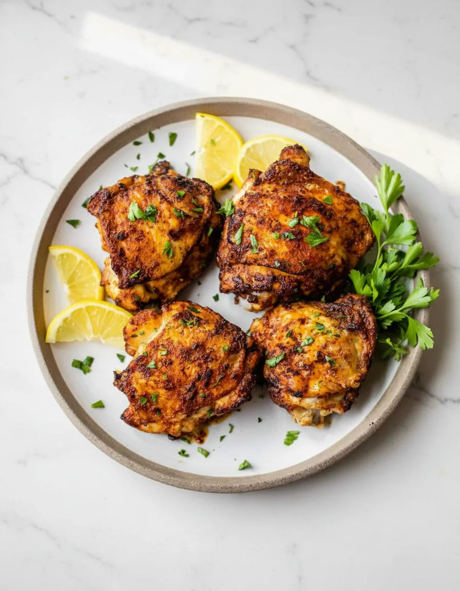 Crispy and juicy air fryer chicken thighs with simple spices ready in 30 minutes