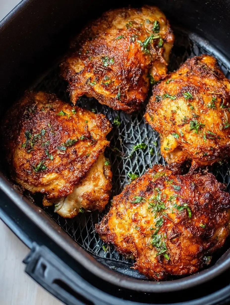 Juicy, bone-in chicken thighs with incredibly crispy skin, seasoned with lemon and herbs and cooked to perfection in the air fryer in under 30 minutes.