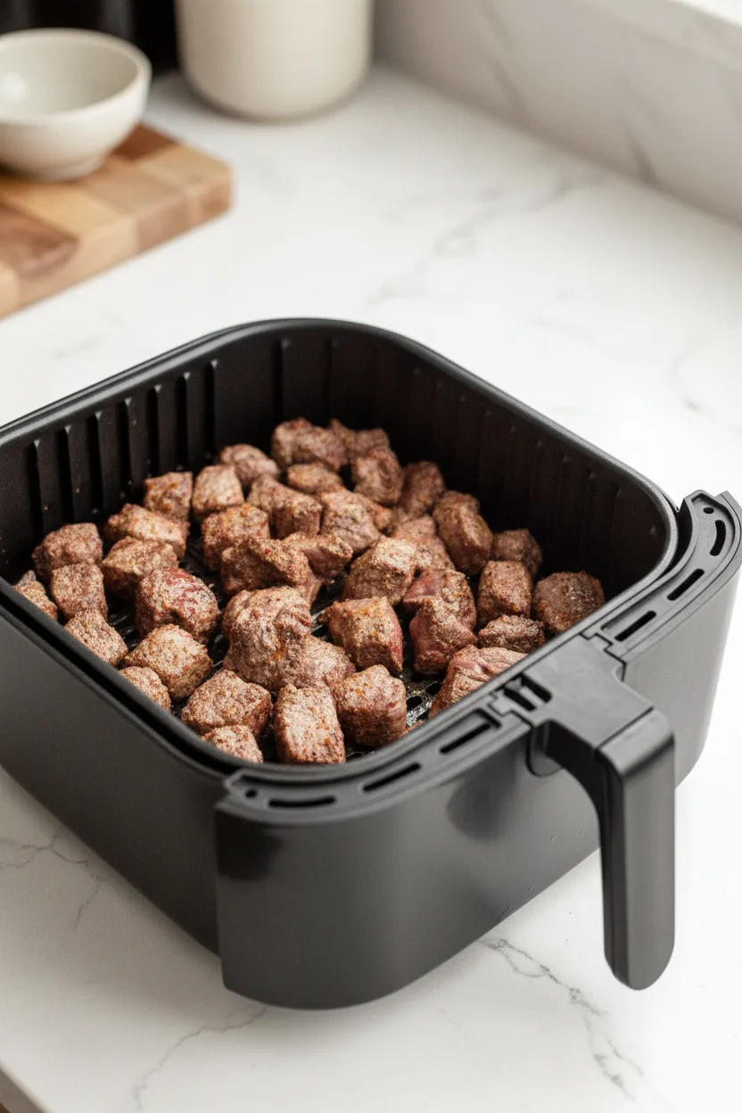 - Arrange steak bites in single layer in preheated air fryer basket