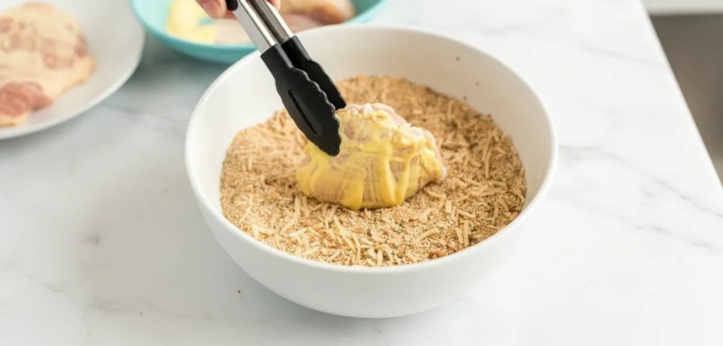 In a small bowl, combine mayonnaise and mustard until smooth. In a separate shallow dish, mix bread crumbs, Parmesan cheese, Italian seasoning, garlic powder, and black pepper. This dual-layer system creates both adhesion and crunch for perfect texture.