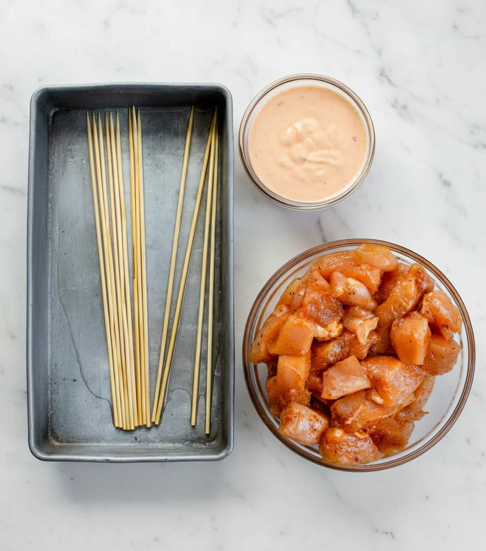 Thread 4-5 chicken cubes onto each soaked wooden skewer. Leave small spaces between pieces to ensure thorough cooking. Arrange completed skewers on a plate while preparing the signature sauce.