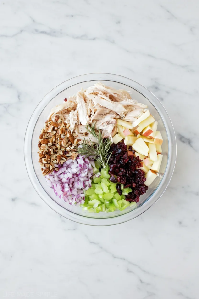- In large mixing bowl, combine cooked chicken, celery, red onion, apple, and dried cranberries.