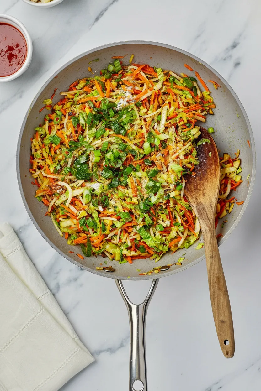 The combination provides textural contrast with crunch from sprouts and natural sweetness from carrots. If you can’t find napa cabbage, regular green cabbage works well. Finely chop or shred harder vegetables to ensure even cooking and easier rolling.