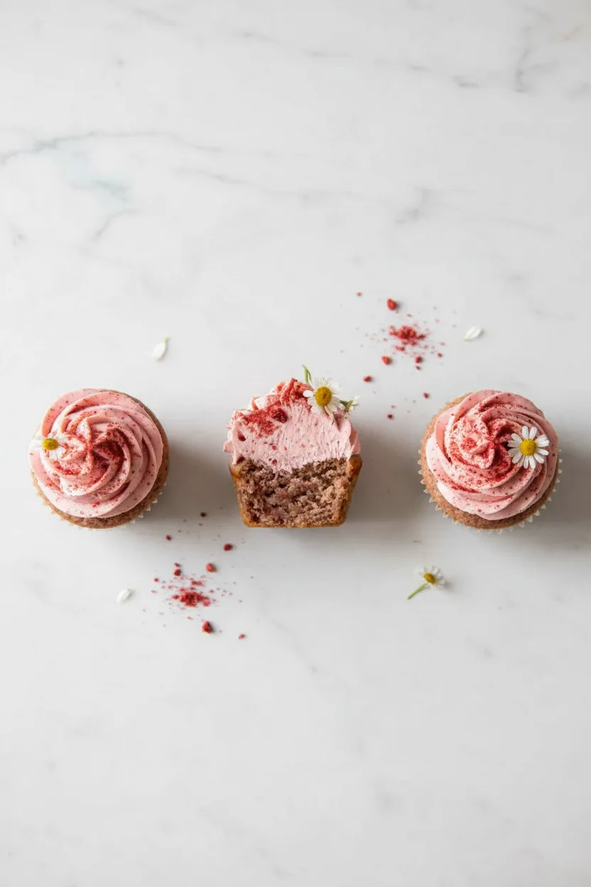 Once the cupcakes are completely cool, frost them generously using a piping bag or a simple offset spatula. For a final decorative touch, sprinkle a little extra crushed freeze-dried strawberry powder on top. If you have edible flowers like chamomile, they make a beautiful, elegant garnish. Your stunning Double Strawberry Frosted Cupcakes are now ready to serve!