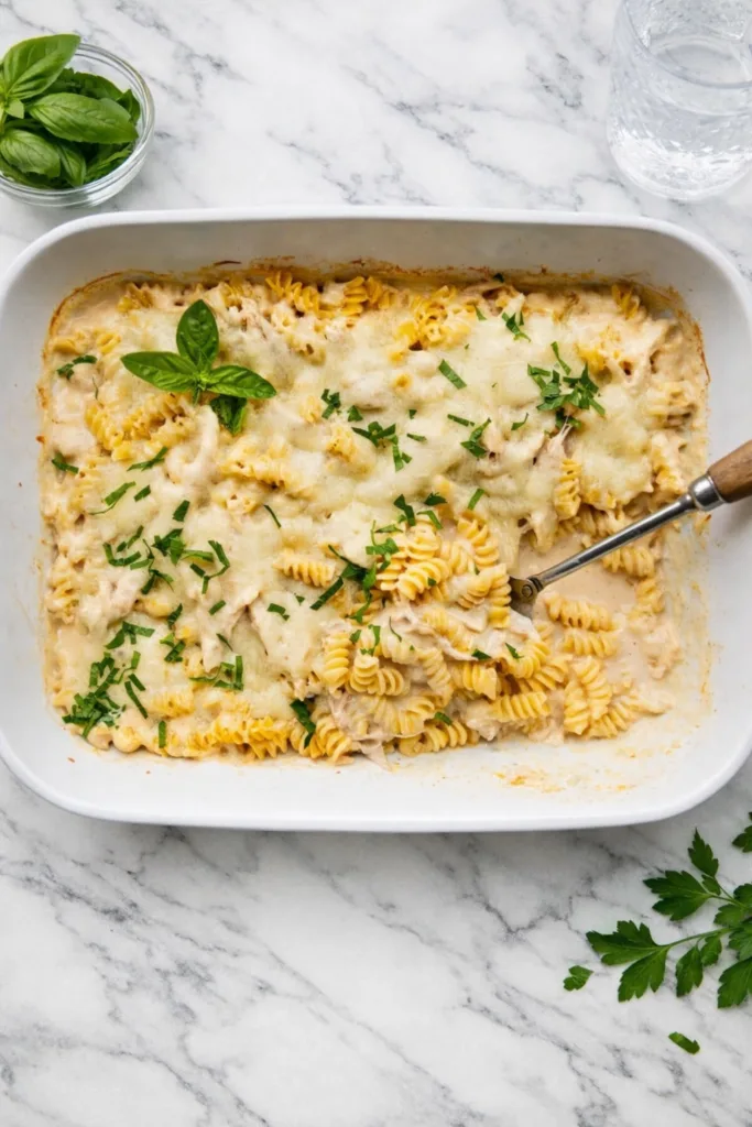 Easy dump-and-bake chicken Alfredo casserole with rotini pasta, creamy sauce, and melty cheese.