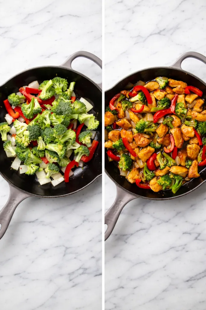 Return chicken to the skillet and pour sauce over everything. The cornstarch activates quickly, creating a glossy coating. Remove from heat once thickened to prevent overcooking vegetables.