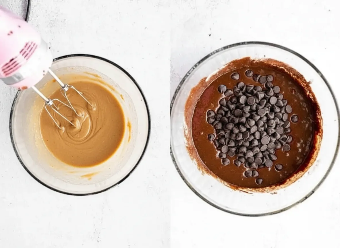 - Add chocolate protein powder, almond flour, cocoa powder, and salt. Beat until smooth batter forms.