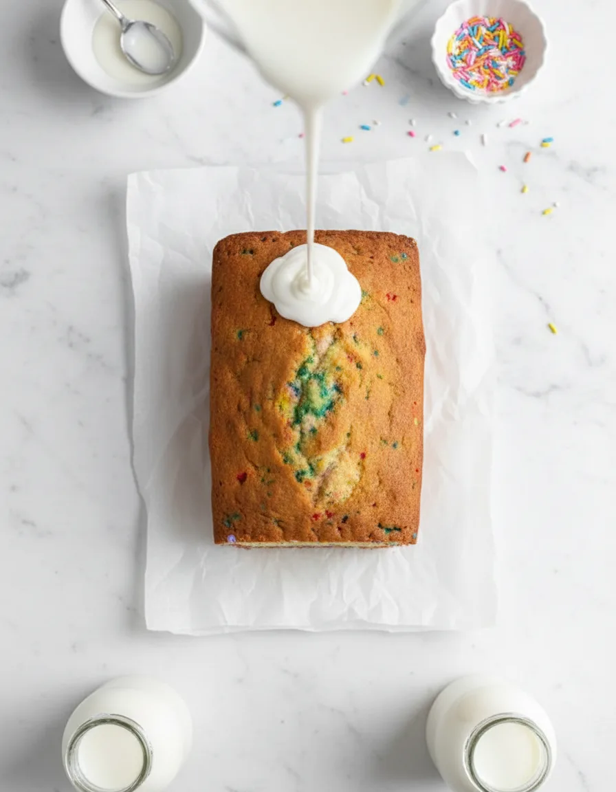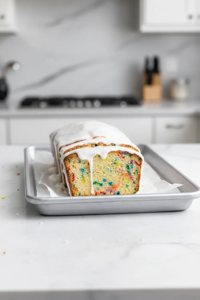 Festive pound cake loaded with rainbow sprinkles and topped with sweet glaze, perfect for birthdays and celebrations.