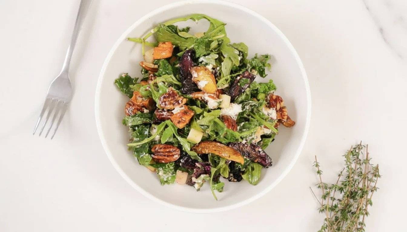 - In a large bowl, combine arugula, kale, diced apple, torn mint, cooled roasted vegetables, and candied pecans. Crumble goat cheese over top. Drizzle with desired amount of dressing, toss gently, and serve immediately.