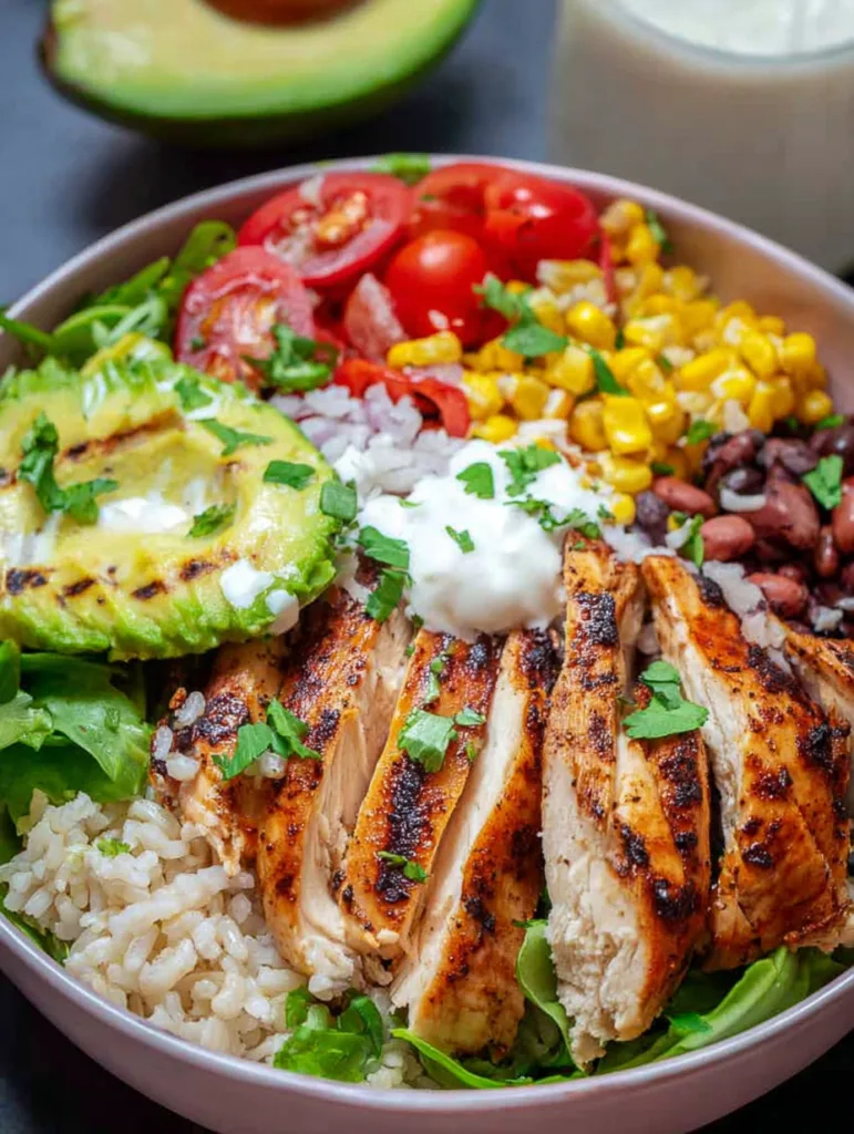 When building your bowl, think layers of texture and color. Start with fresh greens for crunch, then add your warm, seasoned rice. Top it with sliced grilled chicken, creamy avocado, sweet corn, earthy black beans, and juicy cherry tomatoes.