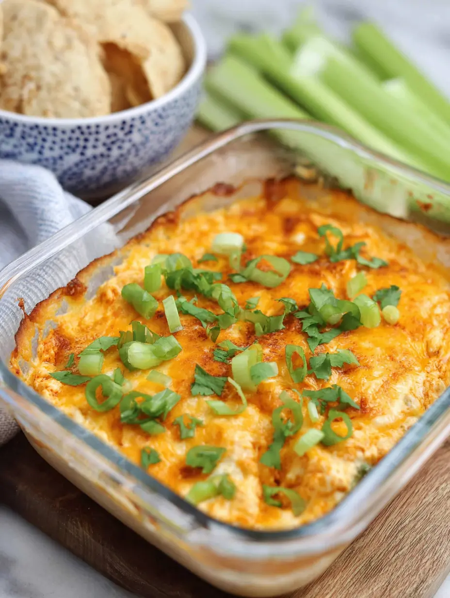 Once done, let it cool for a minute, then garnish with sliced green onions for a fresh, colorful finish. Serve immediately with vegetable sticks, whole-grain crackers, or even celery stalks for the full buffalo wing experience.