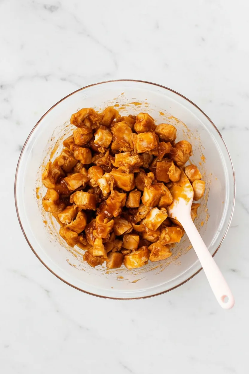 Combine diced chicken, honey garlic sauce, and hot sauce in a small bowl. Toss until every piece gets fully coated. Let it sit for five minutes so flavors penetrate the meat. For optimal results, use chicken cooked with moisture-locking techniques to prevent dryness.