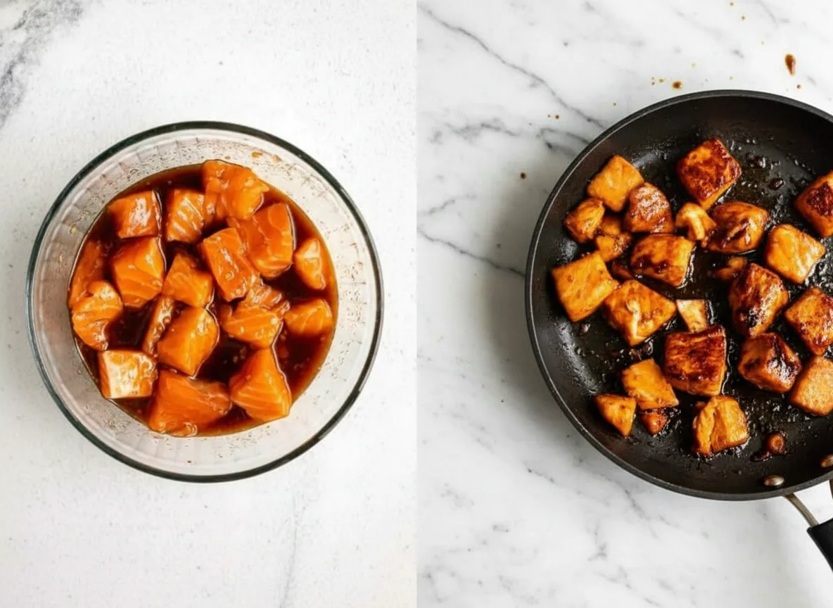 Heat a splash of oil in a skillet over medium-high heat. Once shimmering, add salmon cubes without overcrowding—work in batches if necessary. Sear two to three minutes per side until golden brown. Importantly, reserve leftover marinade for later.