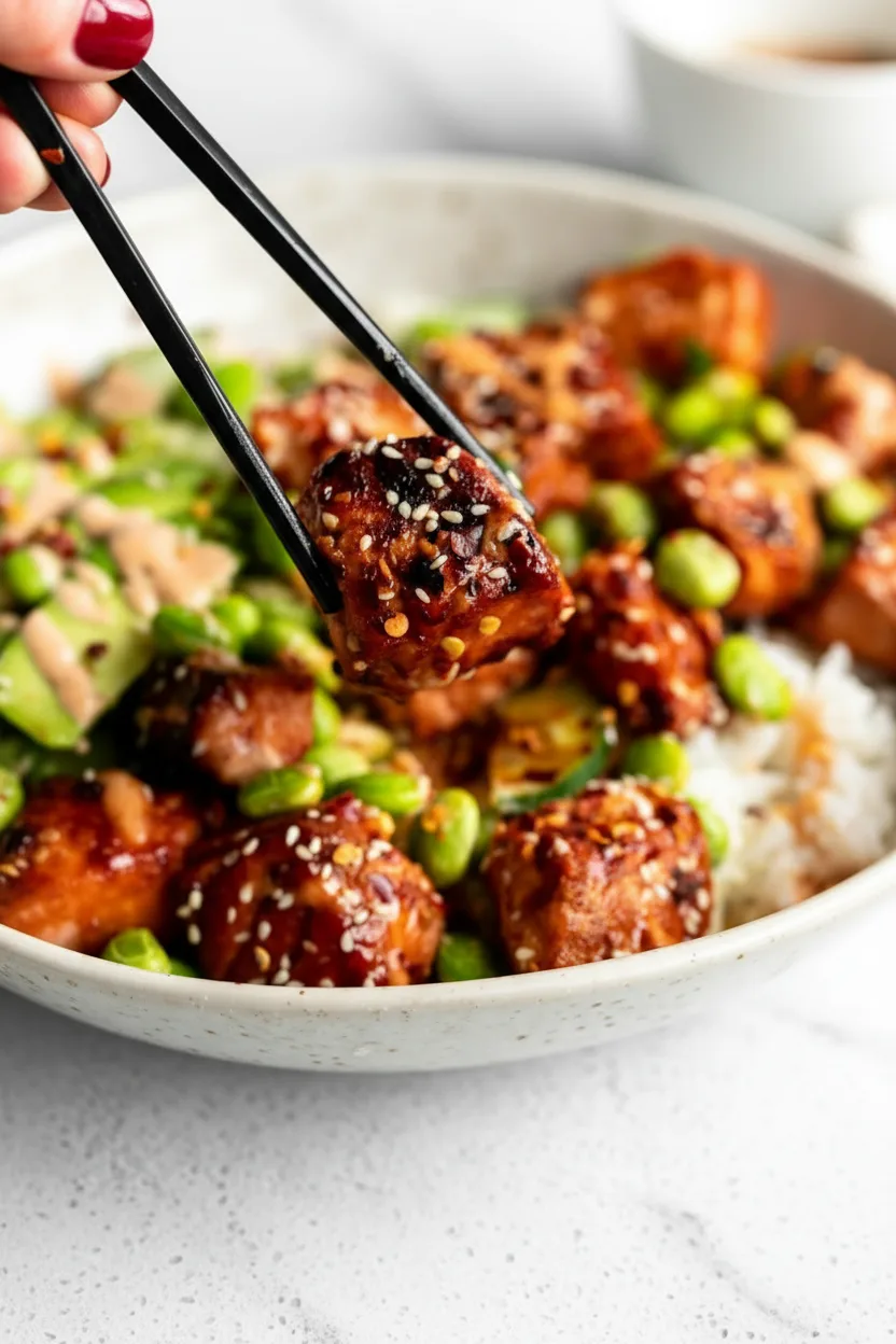 Sweet and spicy salmon cubes served over rice with fresh vegetables and creamy sriracha mayo.