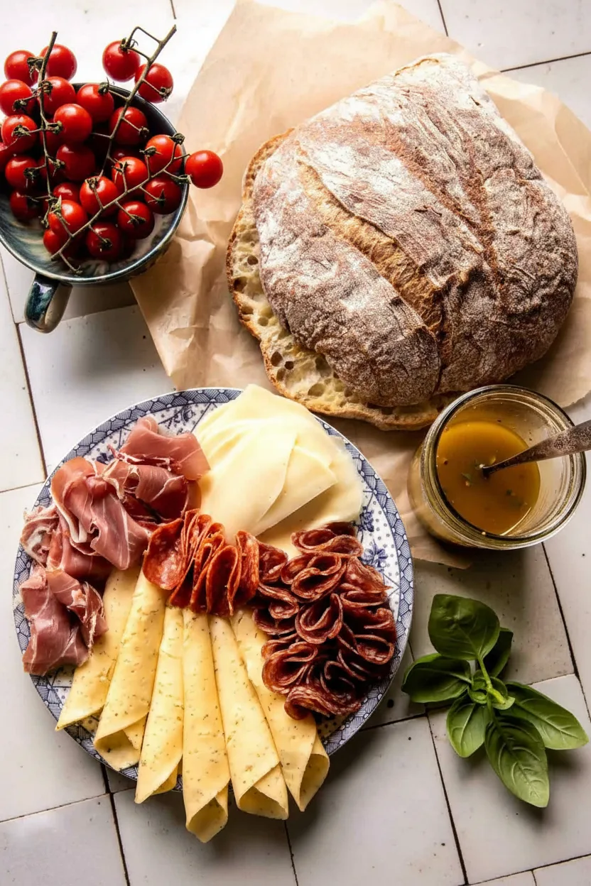 For the meats, you have many options. You can use any combination of your favorite deli slices, like roast beef, turkey pastrami, or ham. Additionally, for a vegetarian version, skip the cured meats and add extra roasted vegetables like zucchini, eggplant, or artichoke hearts. For the cheese, mozzarella, Swiss, or cheddar all work beautifully. Finally, if arugula is too peppery for you, try butter lettuce or spinach instead.