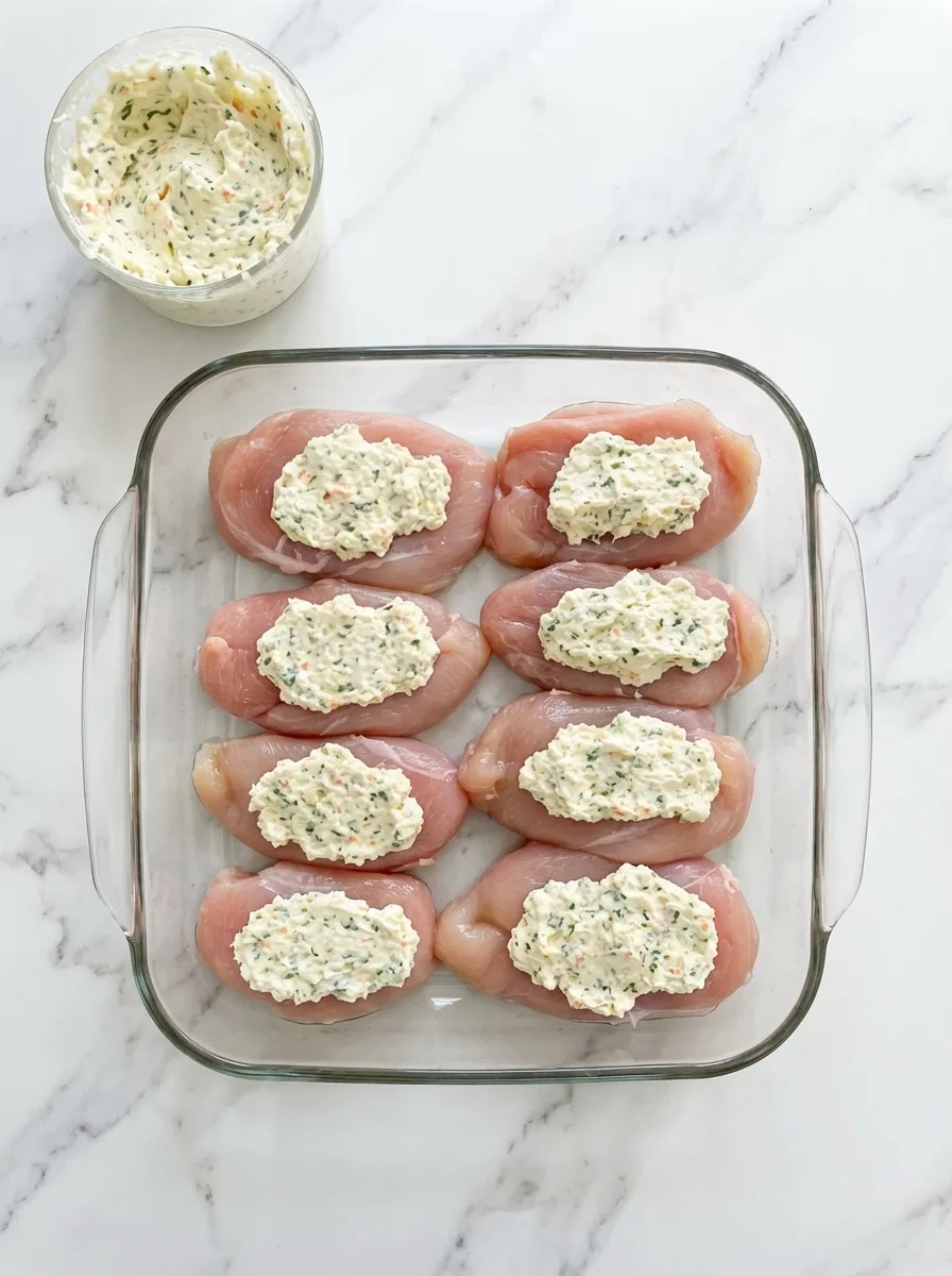 - Spread the mixture evenly on top of each chicken breast, covering the entire surface.