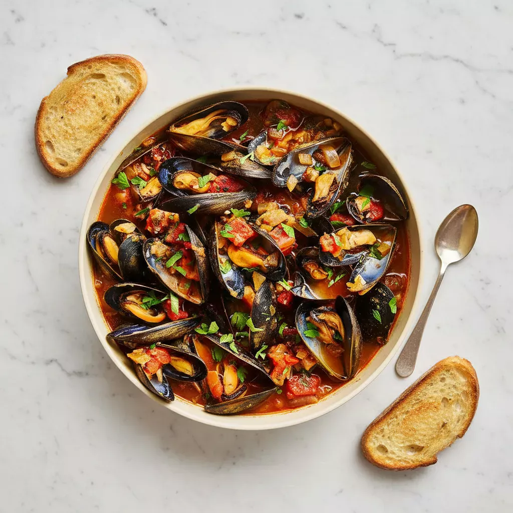 A quick and elegant seafood dinner featuring fresh mussels steamed in a vibrant garlic and tomato broth, served with grilled bread for dipping.