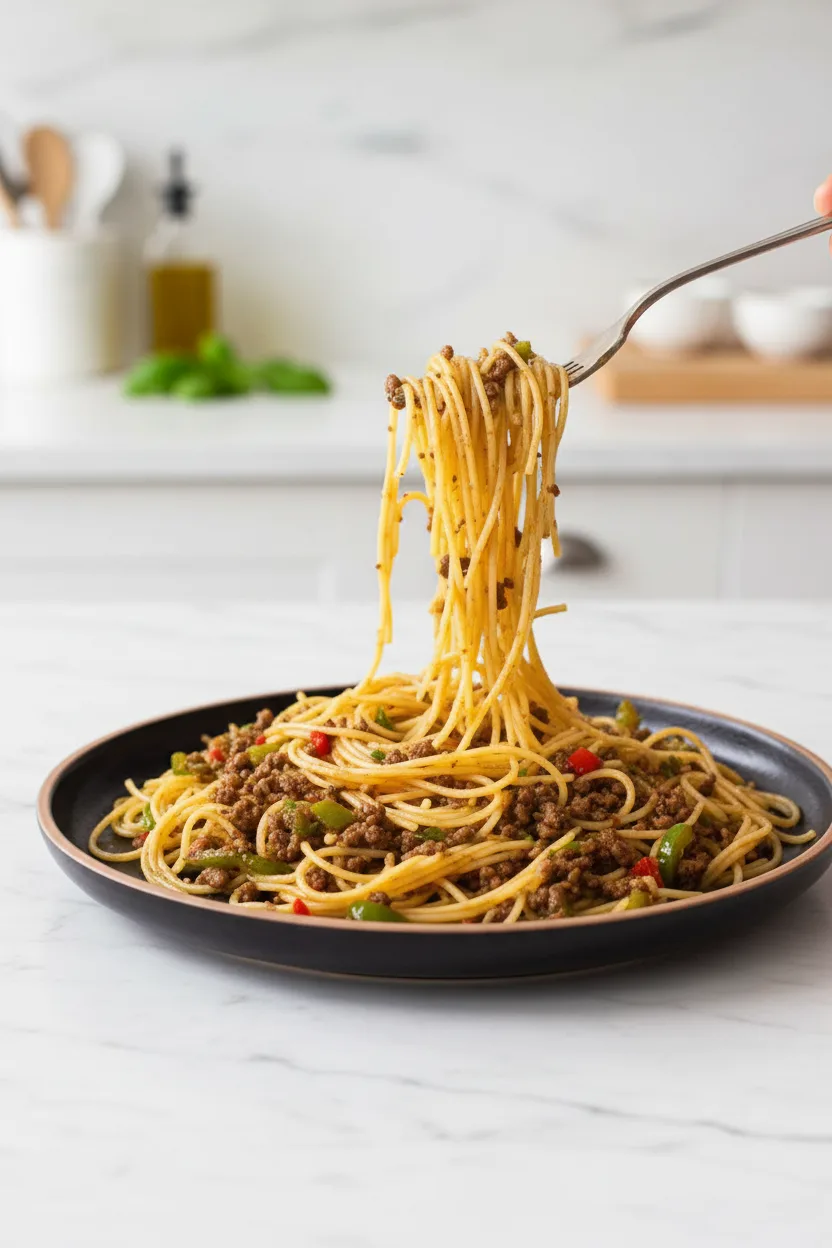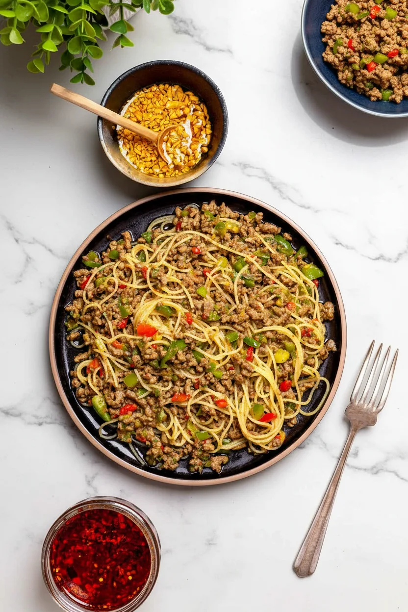 A 30-minute fusion dish combining Chinese beef sauce with tender pasta, packed with garlic and bell pepper flavors.