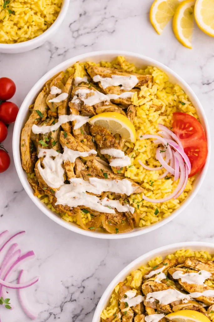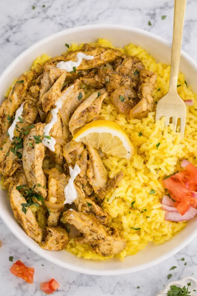 Tender spiced chicken slow-cooked to perfection with aromatic Middle Eastern flavors, served with a refreshing cucumber yogurt sauce. Perfect for easy weeknight dinners or meal prep!