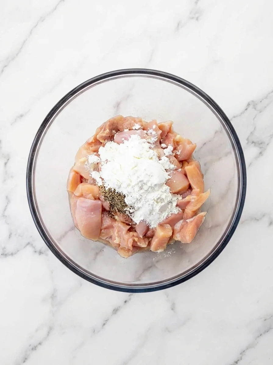 In a large mixing bowl, combine cubed chicken thighs with cornstarch, salt, and pepper. Toss until all pieces are evenly coated. Let this mixture sit while you prepare the sauce. The cornstarch creates a light barrier that locks in moisture during cooking.