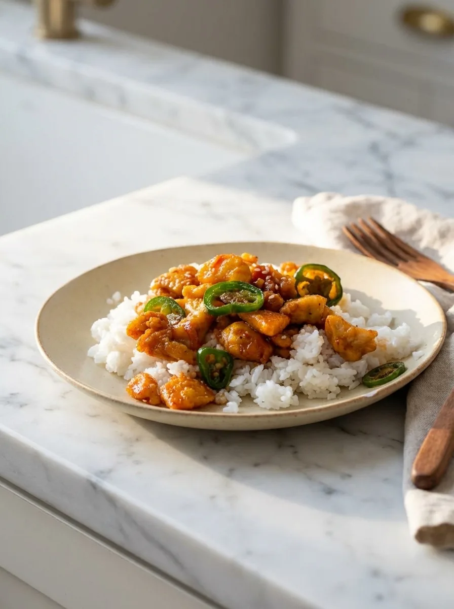 Spicy and sweet glazed chicken with jalapeños served over rice for a quick weeknight dinner